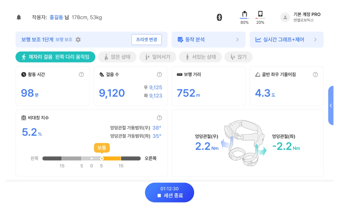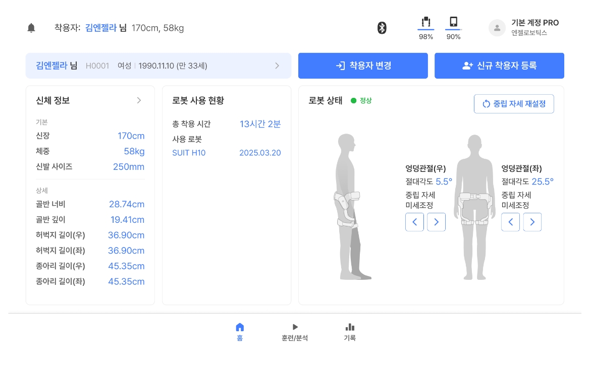 착용자의 상태 및 훈련 전후 개선 효과를 정량적 측정하여