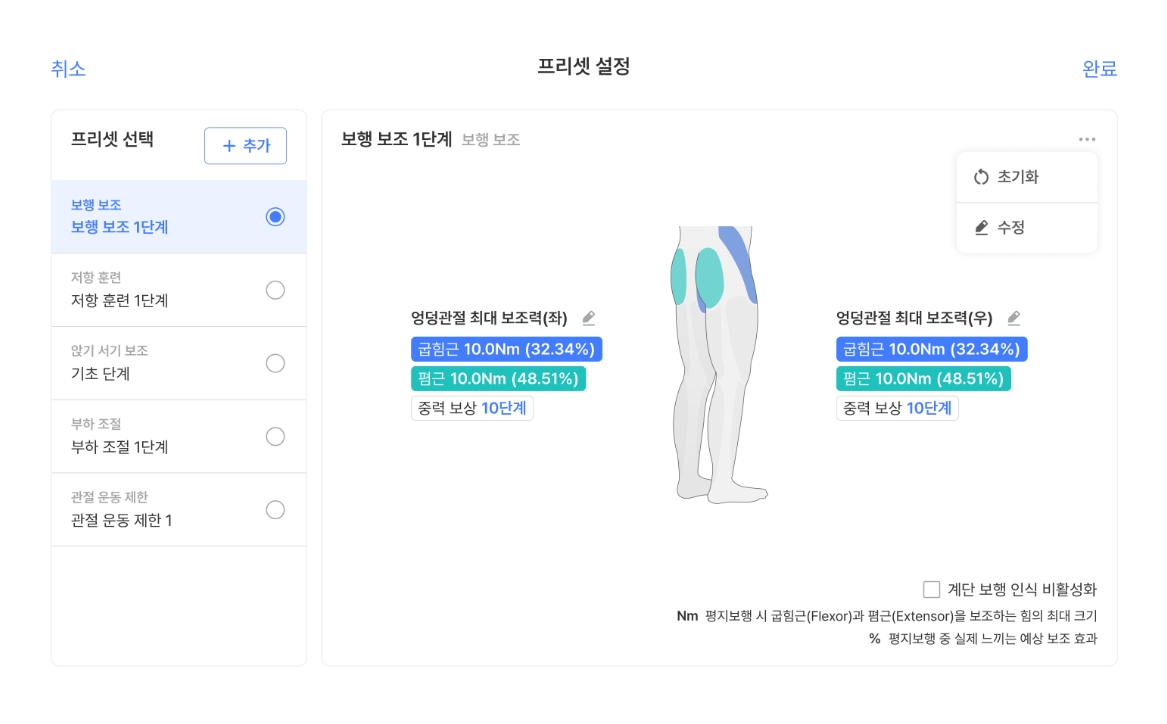 착용자의 상태에 따라 다양한 보조력을 프리셋으로 저장해두어